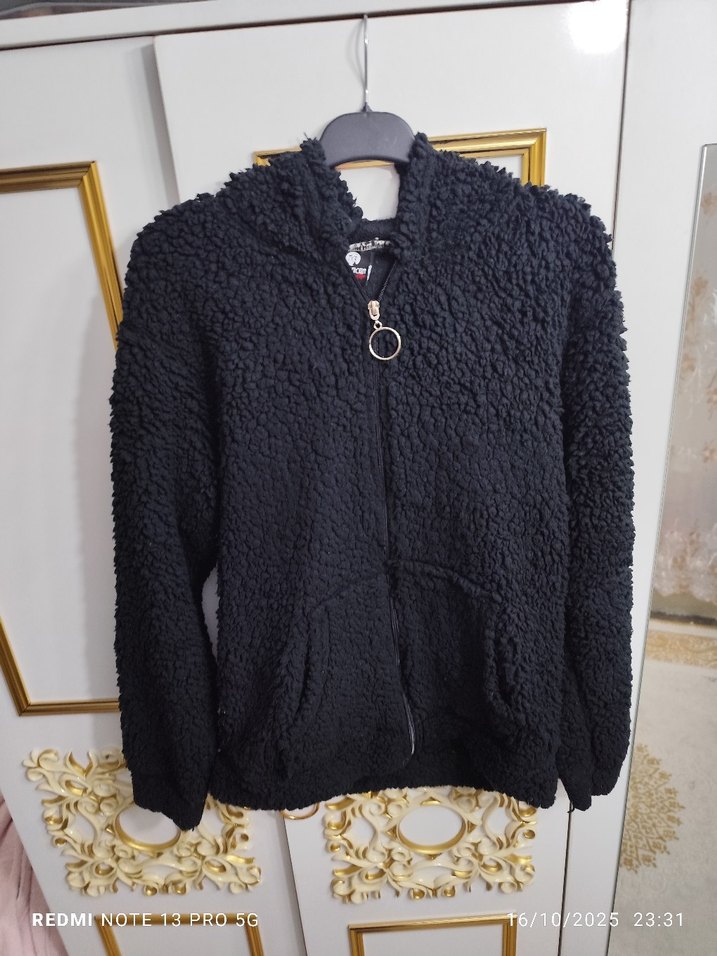 Siyah peluş kumaştan, uzun kollu ve bol kesimli, kürk detaylı kadın ceket. Bisiklet yaka ve fermuarlı, rahat kullanıma uygun.