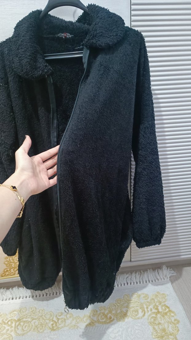 Siyah, bol kesim kadın ceket, yüksek yakalı ve uzun kolludur. Yumuşak peluş kumaştan yapılmış, kürk detaylı ve midi boyda, rahat ve gotik tarzda bir görünüm sunar.