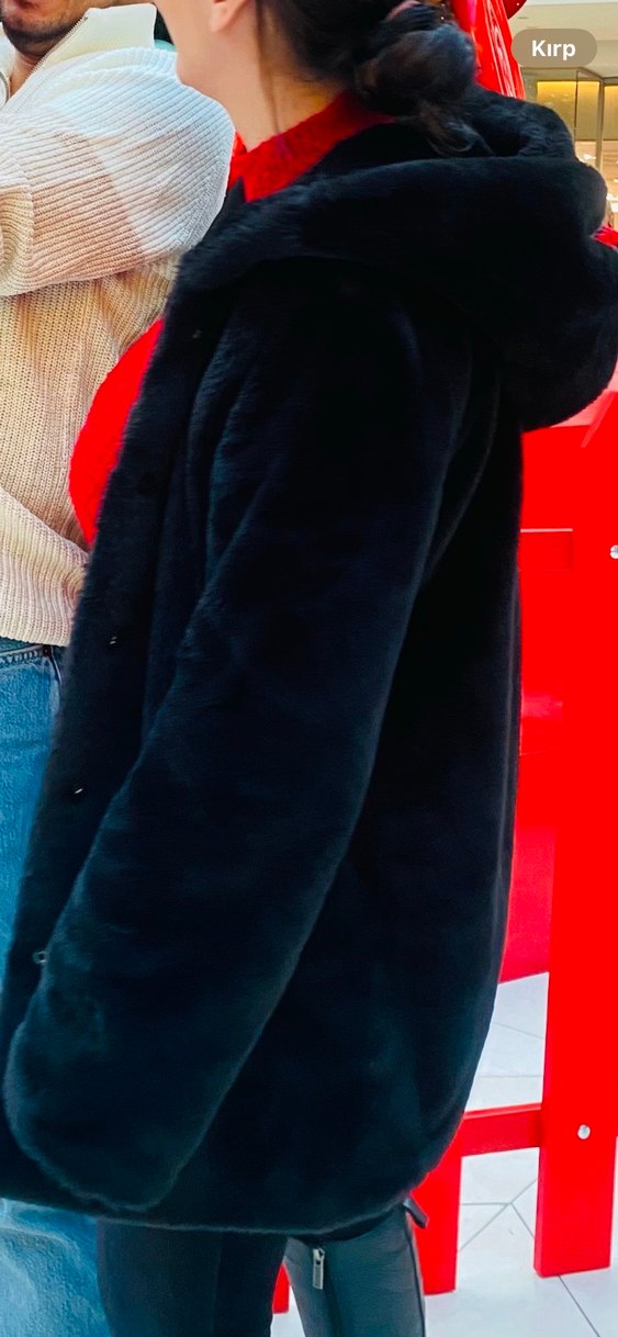 Siyah peluş kaban, kesik yaka ve uzun kollu olup, rahat kesimiyle günlük kullanıma uygundur. Yumuşak ve sıcak kumaştan üretilmiştir.