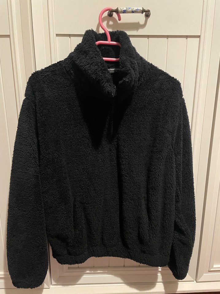 Siyah peluş kumaştan, kürk detaylı, yüksek yakalı ve uzun kollu kadın mont. Salaş kesim ve midi boyda, günlük rahat sokak stili için uygundur.