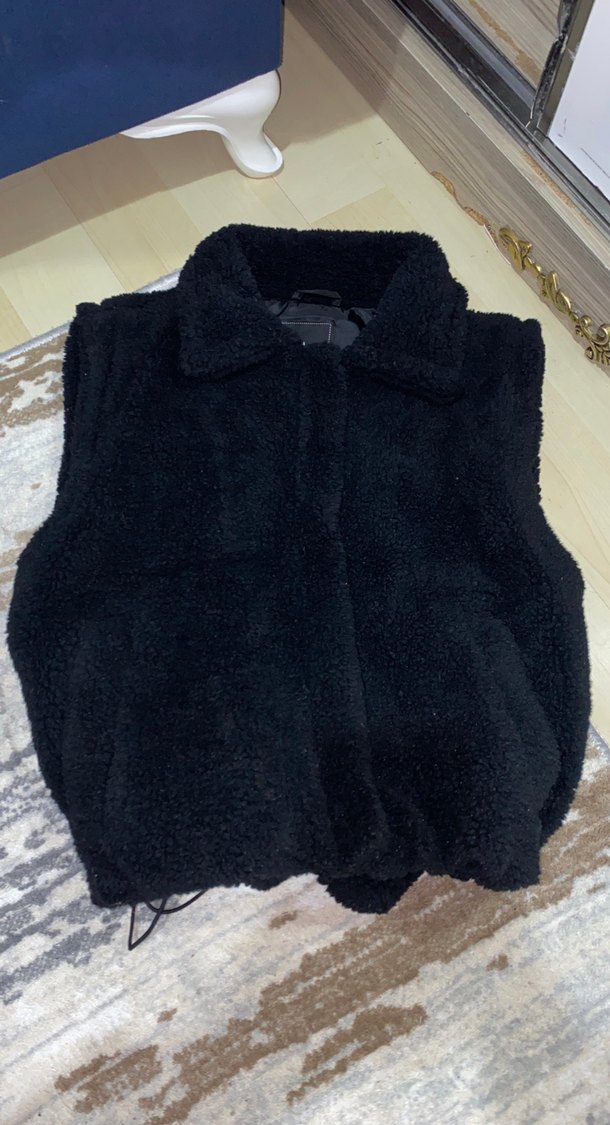 Siyah, yakalı, kolsuz yelek, yumuşak ve sıcak kumaştan. Gevşek kesimi ve peluş detaylarıyla rahat sokak tarzı için ideal.