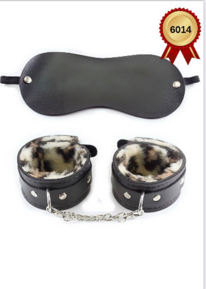 Siyah göz bağı ve peluş kaplı kelepçelerden oluşan kedi aksesuar seti. Kelepçeler zincirle bağlı ve iç kısmı yumuşak malzemelidir.