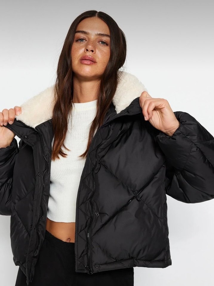 Siyah Peluş Kürklü Kadın Mont