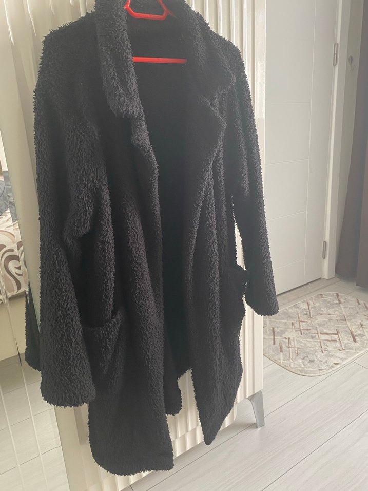 Siyah renkli, peluş dokulu, uzun kollu ve geniş kesimli midi kaban. Yaka kısmı kesik detaylı, günlük kullanıma uygun.