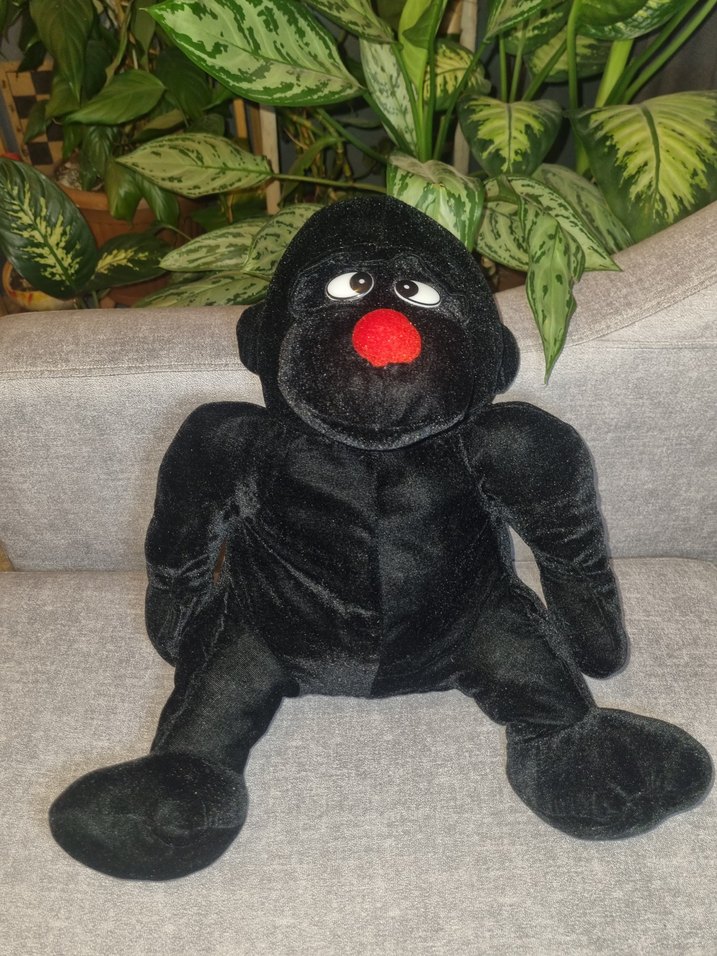 Yumuşak ve koyu siyah peluş goril oyuncak, parlak kırmızı burun ve ifadeli gözlere sahip.
