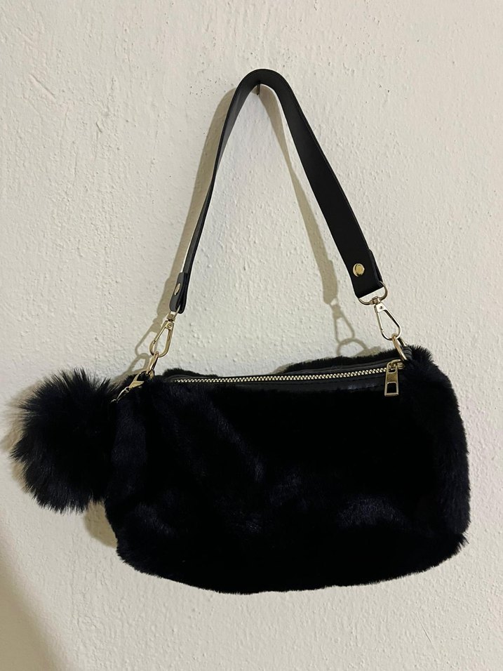 Yumuşak kürk dokulu, siyah kadın çanta. Ayarlanabilir askı ve ponpon detayı bulunur✨