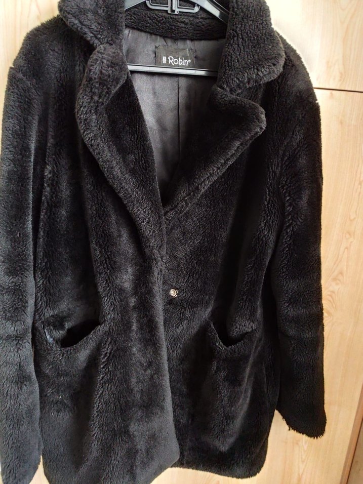 Siyah peluş kaban, notlu yaka ve uzun kollu, bol kesim ve rahat peluş kumaş ile günlük kullanıma uygun.
