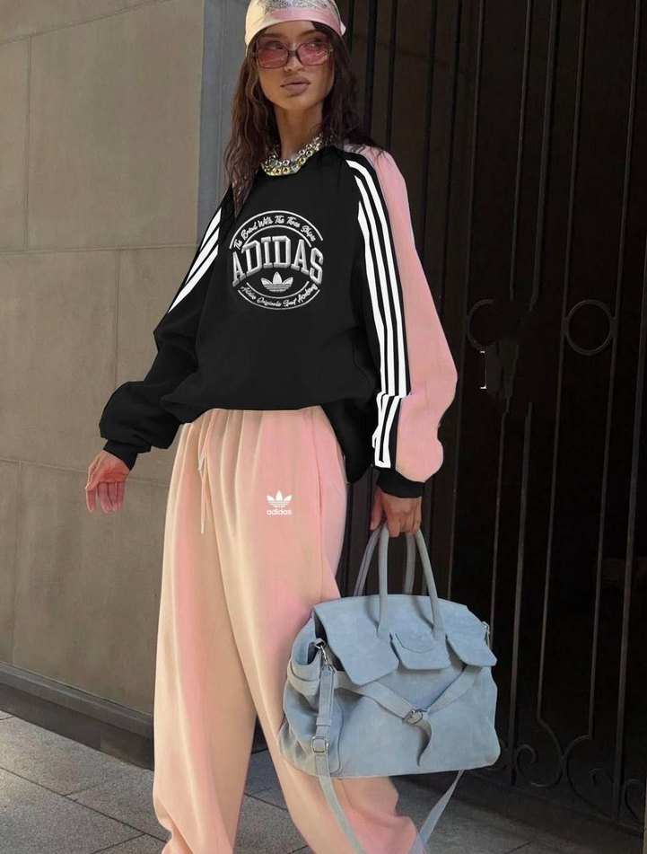 Adidas eşofman takımı, bol kesim ve uzun kollu. Siyah üst baskılı logo detaylı, pastel pembe kollar ve pantolonla tamamlanmış. Rahat ve şık. s m l xl