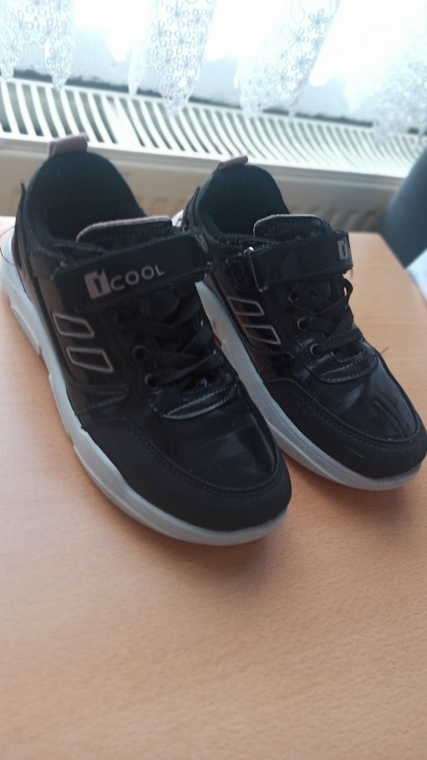 Siyah pembe baskılı kız çocuk spor ayakkabısı, kauçuk tabanlı ve kolay kullanım için cırt cırtlıdır. Trend sokak stili için uygundur.