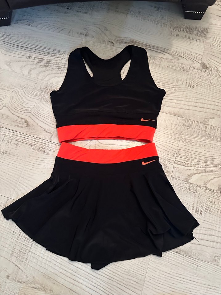 Siyah ve pembe bantlı, askısız ve kolsuz crop top ile uyumlu mini etekten oluşan, sentetik kumaştan yapılmış, spor ve sokak stili için uygun dar kesim kadın spor takımı.