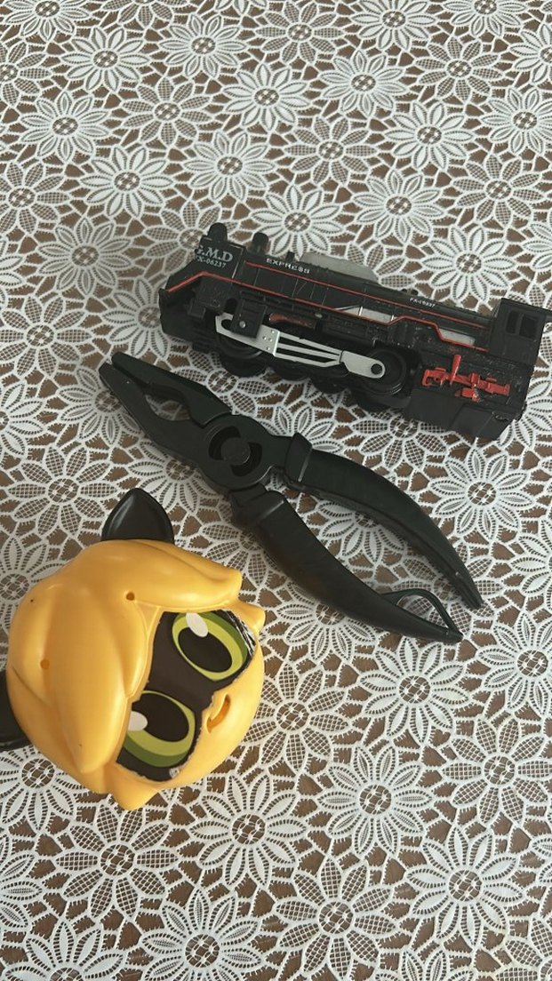 Desenli yüzey üzerinde siyah pense ve sarı kedi figürlü aksesuar bulunuyor.