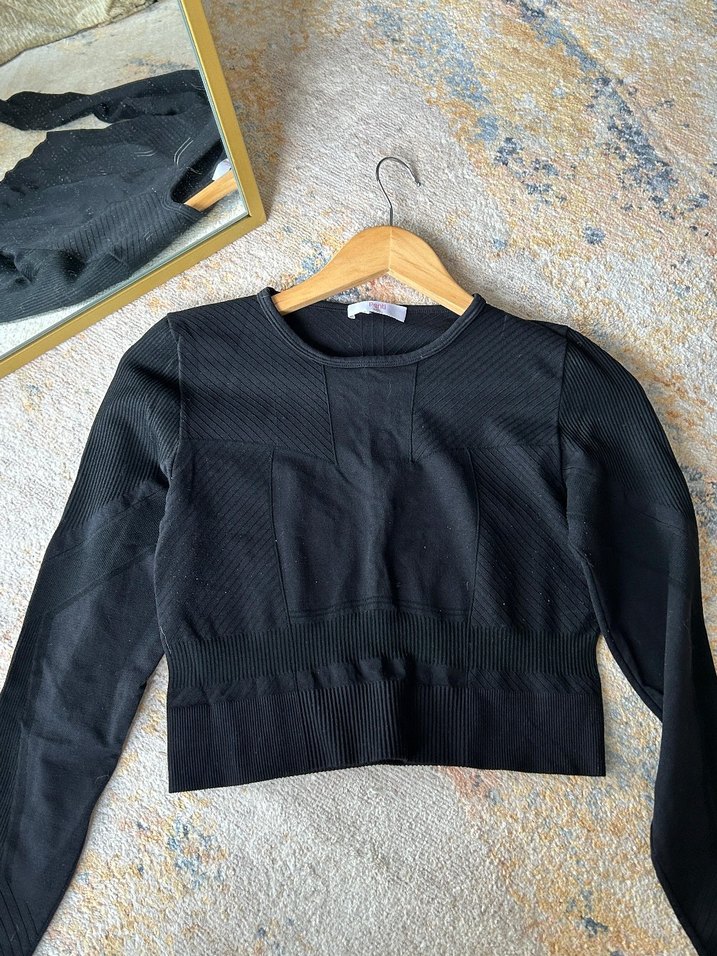 Siyah triko crop top, uzun kollu ve bisiklet yaka tasarımıyla spor ve şık bir görünüme sahiptir. Sentetik kumaştan yapılmış, orta uzunlukta ve dar kesimdir.