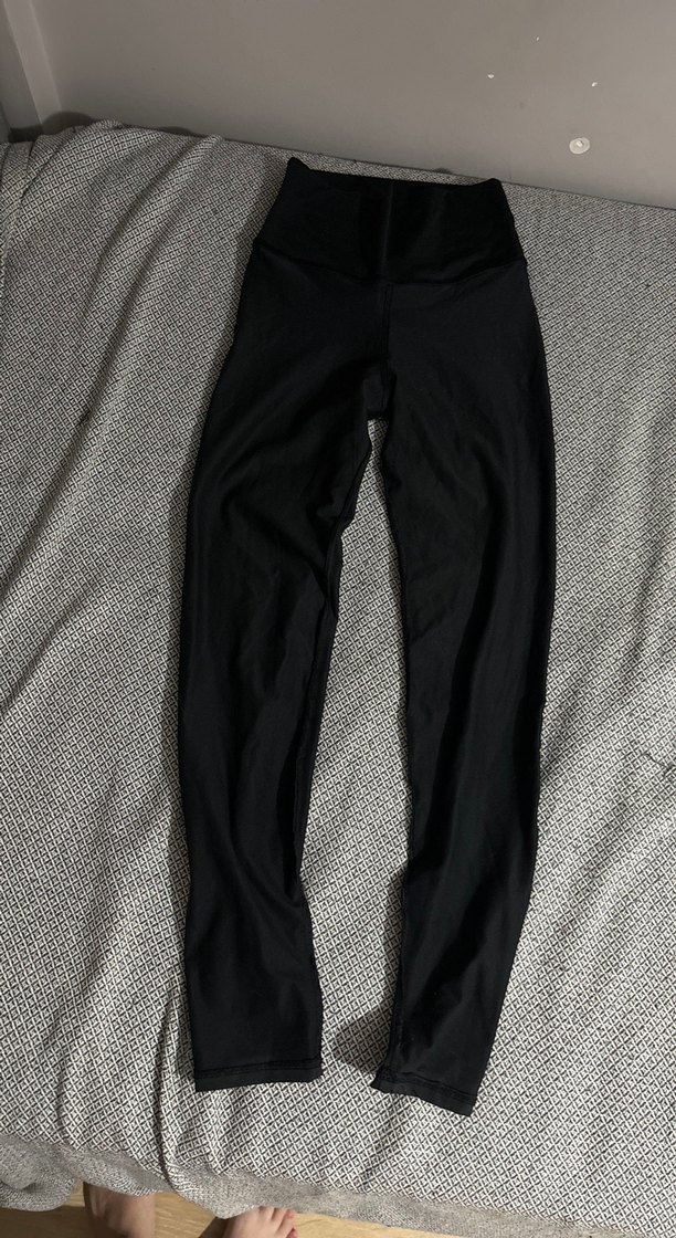 Yumuşak sentetik kumaştan yapılmış siyah, vücuda oturan kadın midi tayt, günlük rahat kullanım için uygundur.