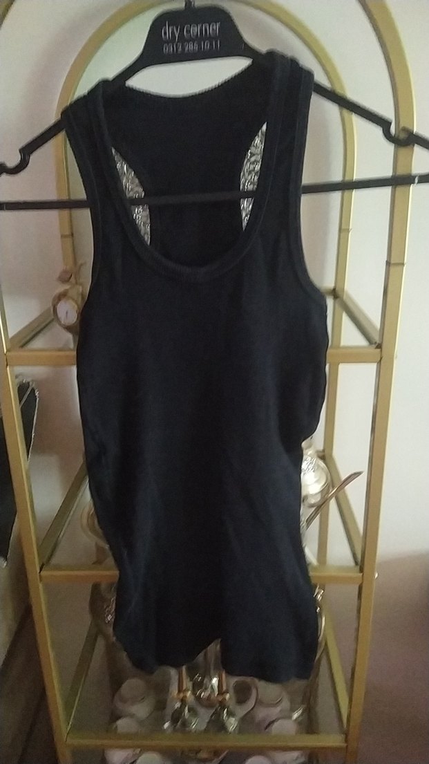 Siyah, dar kesim, kolsuz atlet. Yumuşak penye kumaştan üretilmiştir.