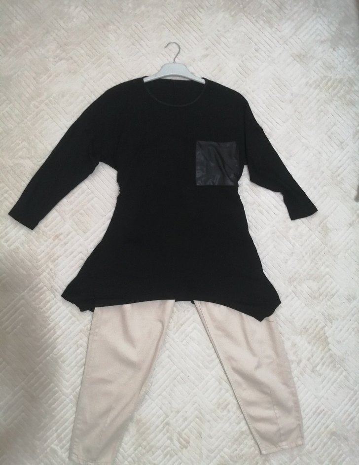 Siyah pamuklu kumaştan, uzun kollu, yuvarlak yakalı, salaş kesim midi uzunlukta günlük kullanıma uygun rahat bir tuniktir.