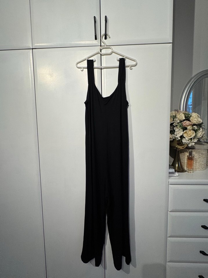 Hamileyken giydim Siyah keten kumaştan, V yakalı ve askılı, bol kesim uzun tulum, günlük kullanım için zahmetsiz şıklık sunar.