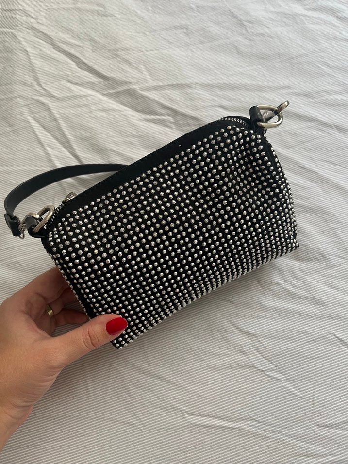 Siyah sentetik kumaştan, gümüş perçinli ve kemerli kayışlı çanta. Koyu puantiyeli deseniyle rock punk tarzını Paris havasıyla buluşturur.