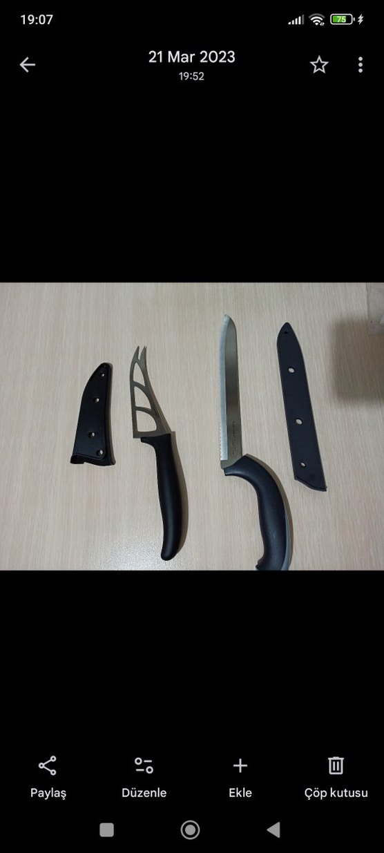 Kesme delikli peynir bıçağı ve koruyucu kılıflı ekmek bıçağı, siyah saplı set.