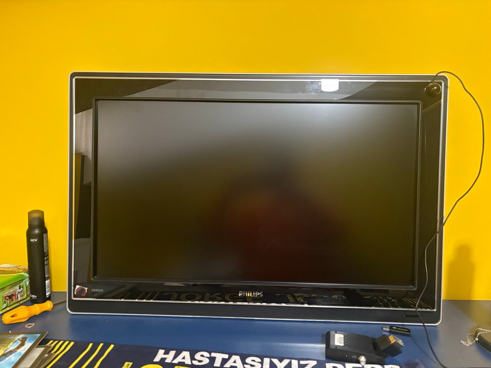Bu Philips monitör sarı çerçeveye ve net bir ekran görüntüsüne sahiptir. Ekranda "HASTAS, PHILIP" yazısı görünür.