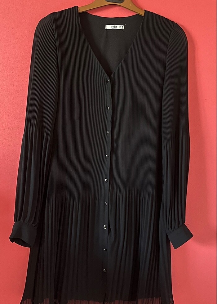 Siyah pileli şık gömlek, kol kısmında astar yok o nedenle kol kısmı iç gösterir