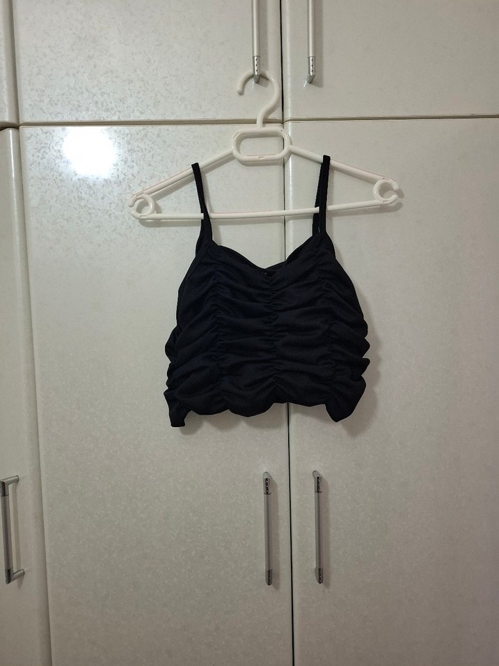 Siyah renkli, ince askılı ve pile detaylı bustiyer. Şortunu beğendiğim içim takım olarak almıştım, bustiyeri hiç giymedim. defosuzdur.