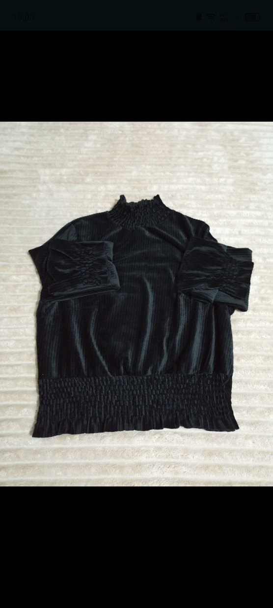 Yüksek yakalı ve pilili detaylara sahip siyah bluz, yumuşak sentetik kumaştan, bol kesim ve uzun kollu olarak tasarlanmıştır.