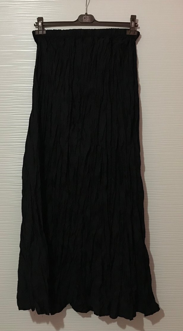 Siyah kumaştan, pileli kırışık uzun etek. Günlük kullanıma uygun sade gotik tarz.