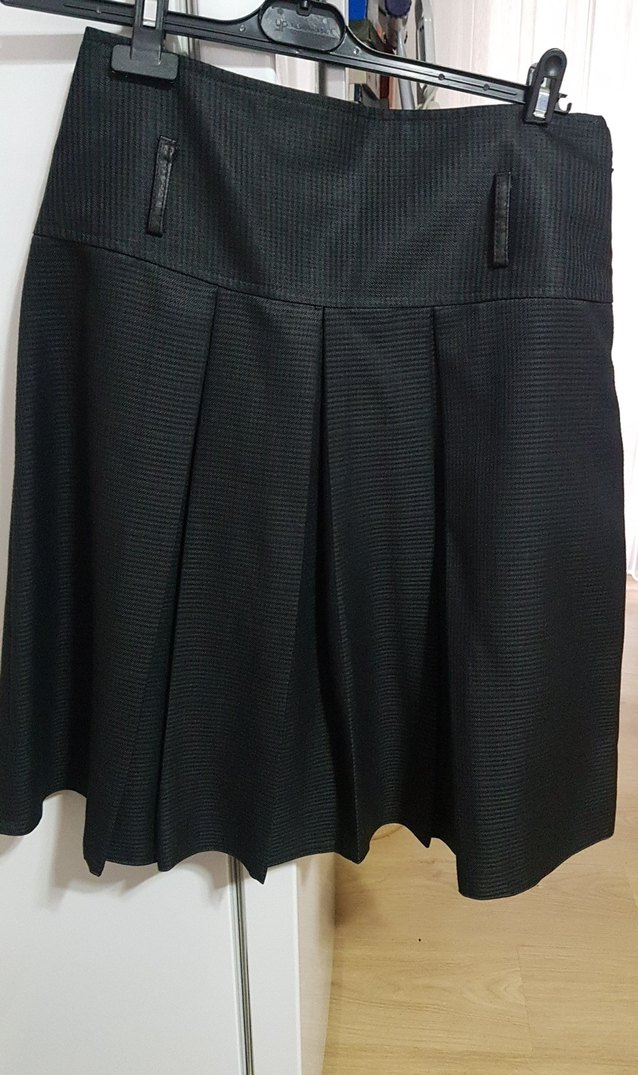 Siyah sentetik kumaştan, pileli ve kısa kesim ofis için iş tarzına uygun.hiç giyilmedi.arkasıda pilelidir