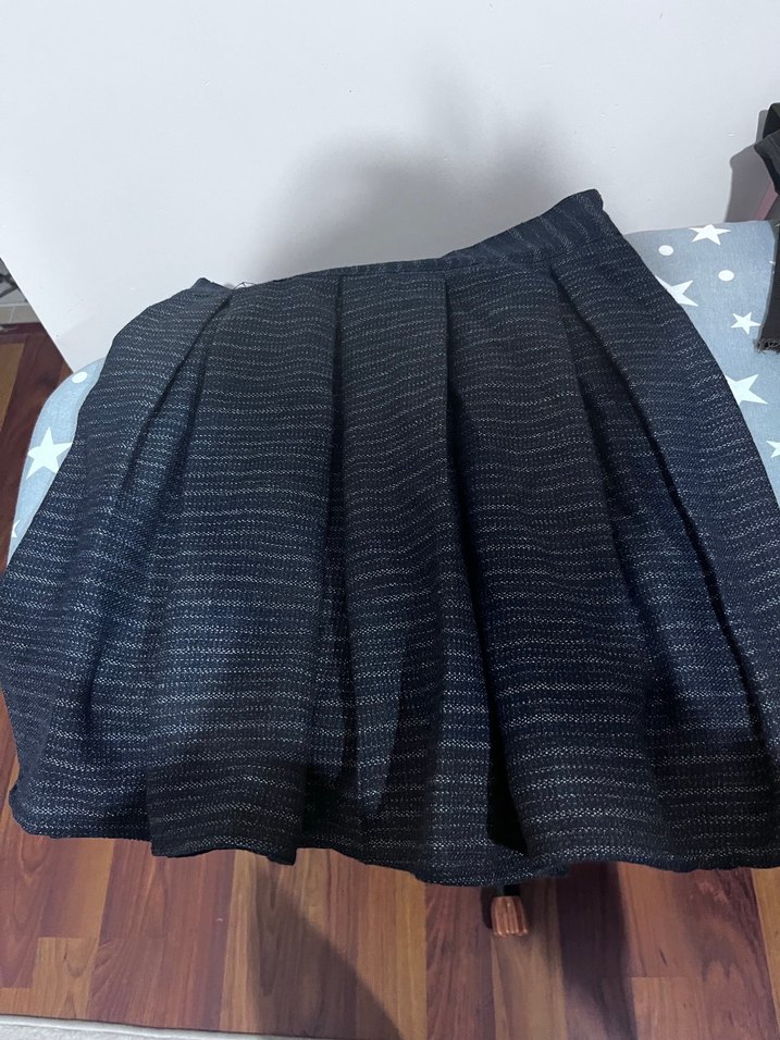 Siyah renkli, pileli ve bol kesimli midi kadın eteği. Sentetik kumaştan üretilmiş, günlük kullanıma uygun rahat gotik tarzda.