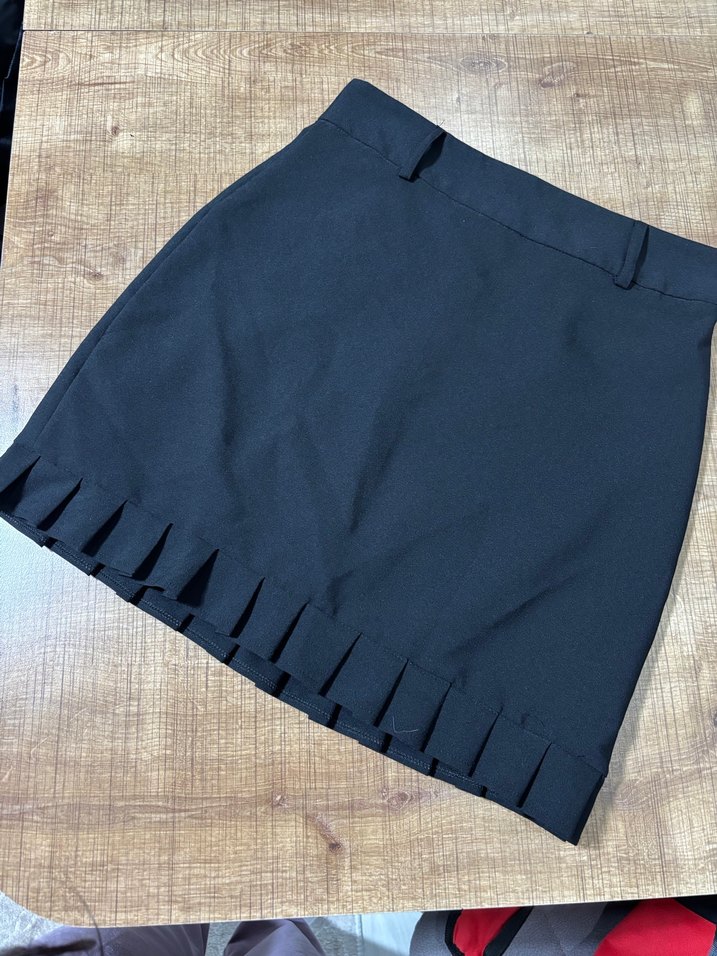 Siyah renkte, sentetik kumaştan yapılmış, pile detaylı ve vücuda oturan mini etek. Ofis için uygun, gotik tarzda bir parça. ✨