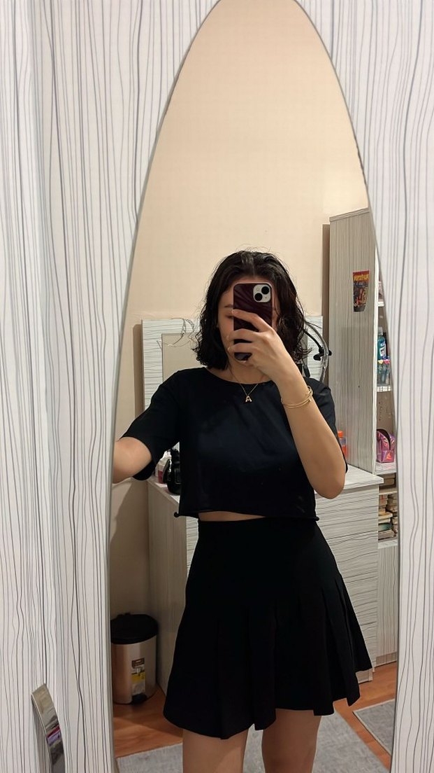 Siyah, mini ve vücuda oturan bu etek, ipeksi dokusu ve minimal gotik tarzıyla günlük kullanıma uygun, zahmetsiz şıklık sunar.