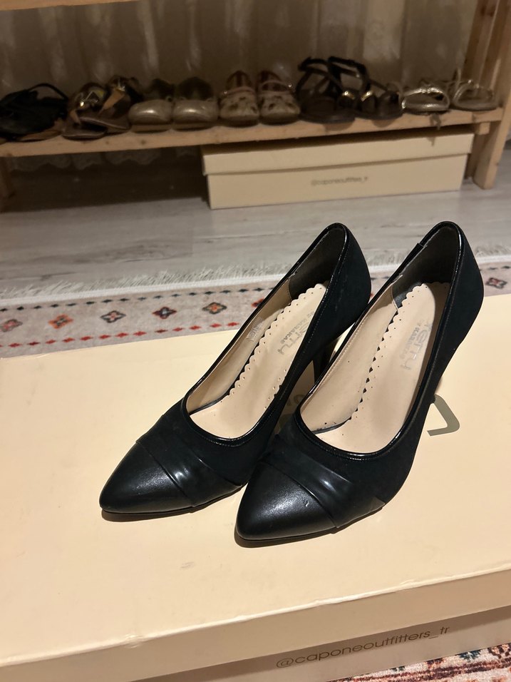 Siyah renkte, pileli detaylı, kauçuk malzemeden yapılmış stiletto topuklu ayakkabı. Modern klasik tarzda, ofis kullanımı için uygundur. Desensiz ve şık.