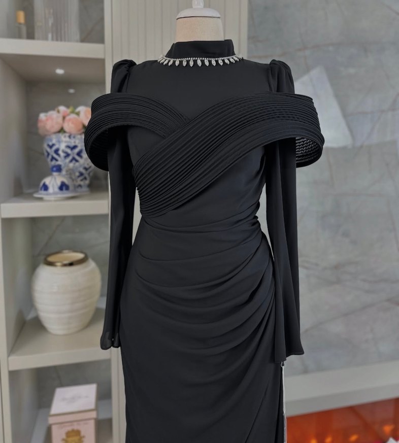 Siyah Pileli Uzun Kadın Abiye Elbise
