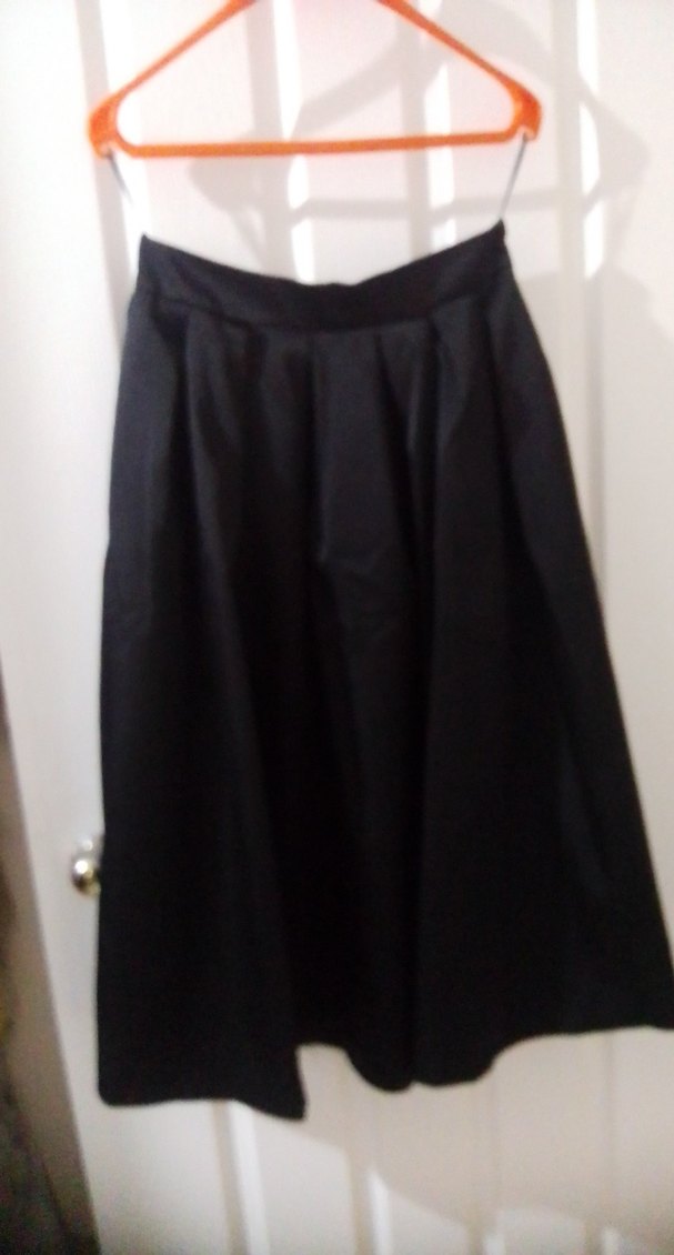 Siyah renkli, pileli ve bol kesimli, ipeksi dokulu uzun kadın eteği. Gotik tarzda, ofis kullanımı için uygun.