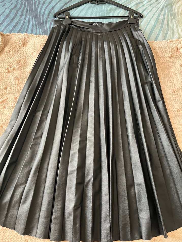 Siyah renkli, pileli deri ve bol kesim uzun etek. Düz siyah, sentetik kumaştan yapılmıştır. Gotik tarz ve ofis ortamı için uygundur. Hiç kullanılmadı