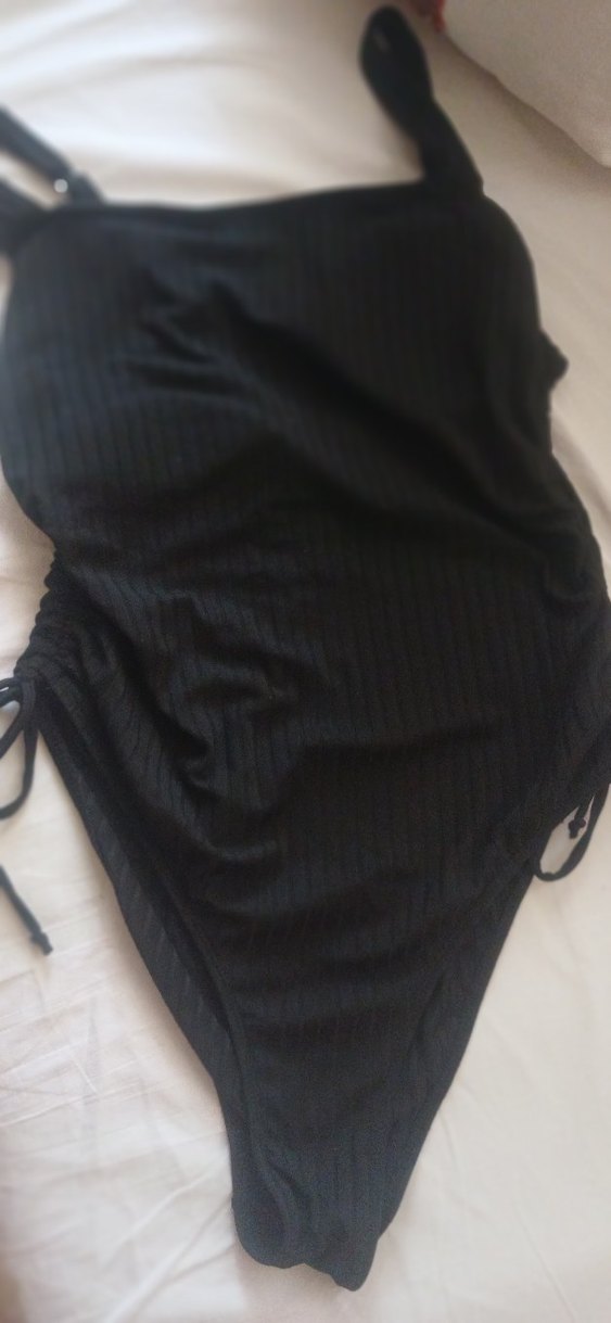 Siyah, askılı, pilili detaylara sahip, vücuda oturan kadın mayo. Günlük kullanım için goth esintili athleisure tarzında.