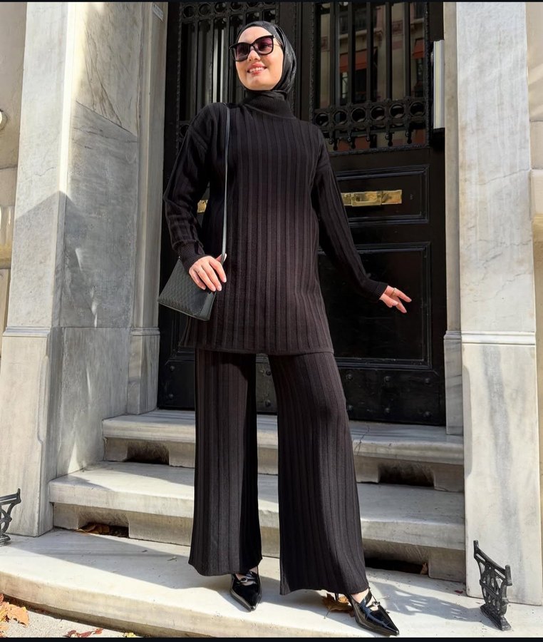 Kadınlar için siyah, pilili, boğazlı ve uzun kollu triko kumaştan yapılmış takım. Regular fit ve uzun boyda, günlük sokak stili için uygundur.