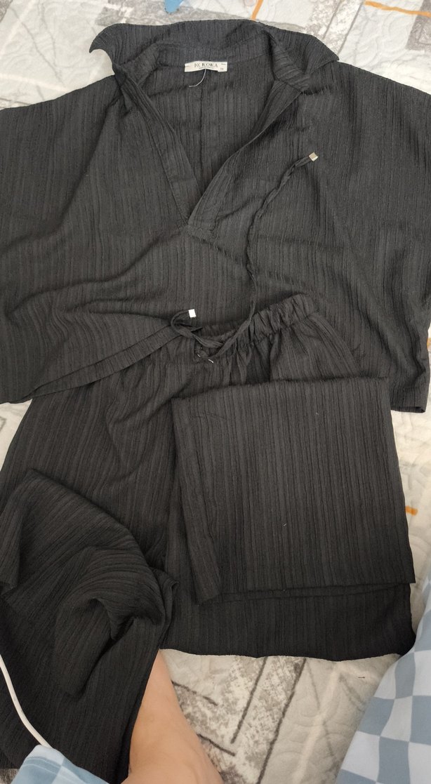 Siyah, pilili dokusu ve kısa kollu, yakalı tasarımıyla bol kesim takım . yeni adım ve hiç giymedim çok şık ve rahat bı takım