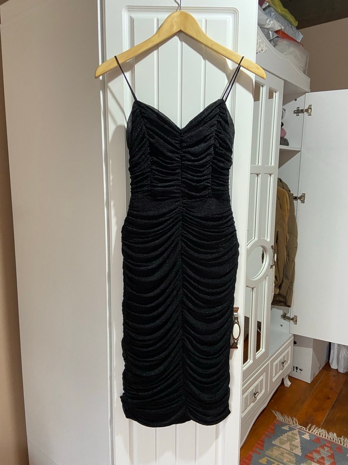 Vücuda oturan, ince askılı siyah pilili elbise. Cesur gotik tarzı ve romantik geceler için uygundur.
