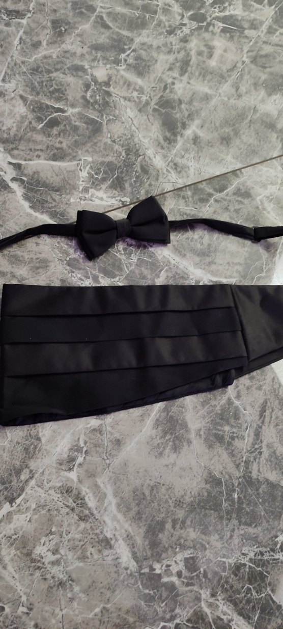 Düğünler için uygun siyah pilili papyon ve kuşak seti, koyu gotik tarzda. Normal kesim ve midi boy ile şık görünüm sağlar.