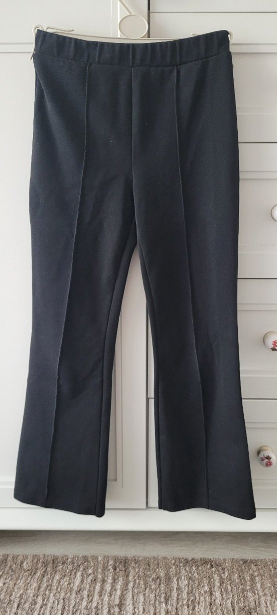 Siyah, kalın, ispanyol paça ve pilili detaylara sahiptir. Sorunsuz. Sayılı kullanıldı.
