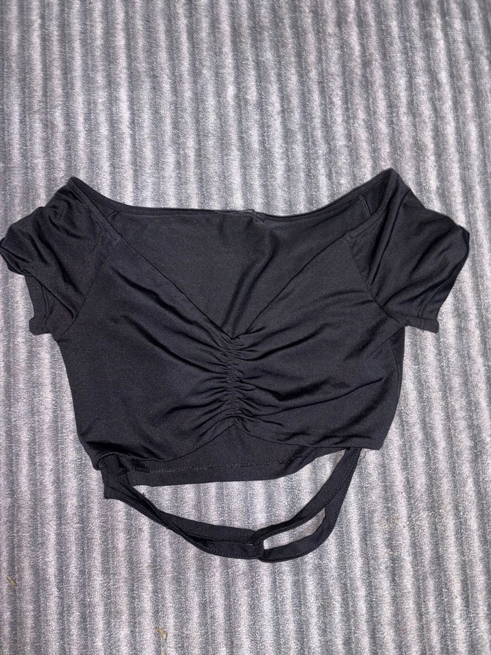 Siyah, pilili ve vücuda oturan crop top, kayık yaka ve askılı kollara sahip, yumuşak sentetik kumaştan üretilmiştir. Günlük kullanım için uygundur.