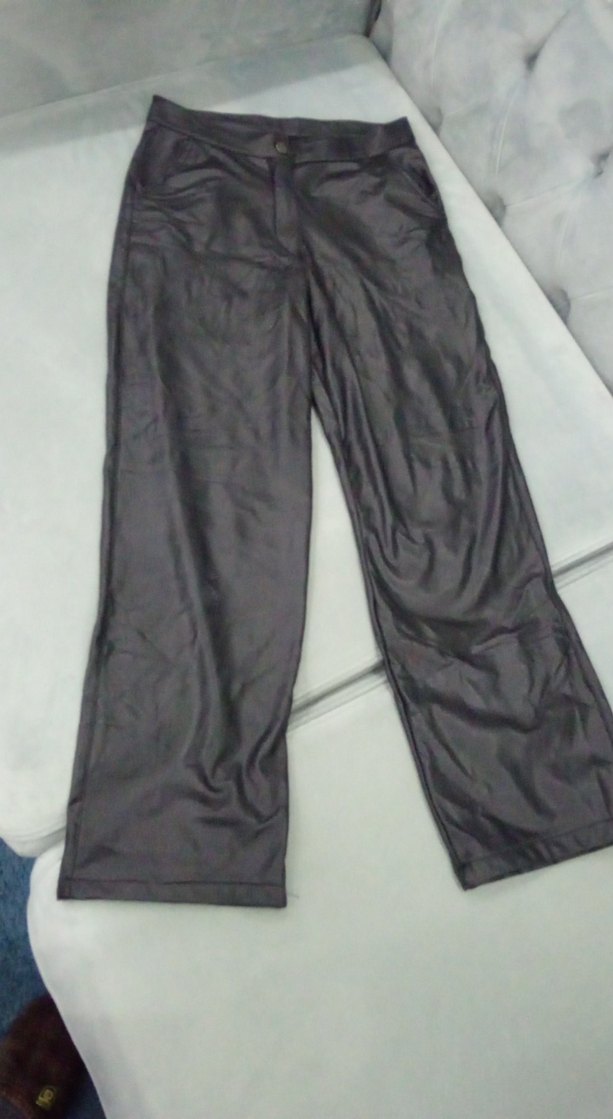 Siyah renkte, pilili ve bol kesim kadın deri pantolon. Yumuşak sentetik kumaştan, günlük dış mekan kullanımı için uygundur.