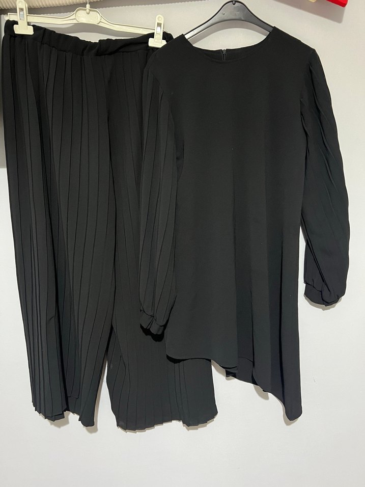 Uzun kollu, yuvarlak yakalı üst ve pilili uzun pantolondan oluşan kadın takımı. Keten kumaştan, rahat kesimli, minimal ve normcore tarzda, ofis kullanımı için uygun siyah renkli takım. ✨