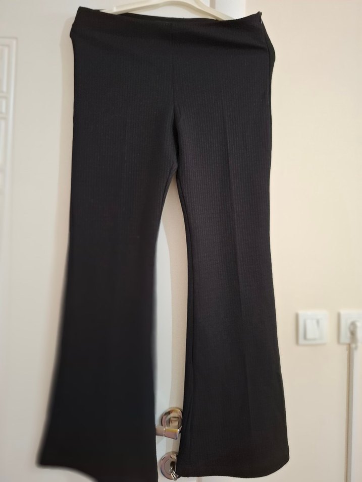 Siyah, pilili, regular fit ve midi boy kadın ispanyol paça pantolon. Sentetik kumaştan, ofis ve sokak stili için uygun.