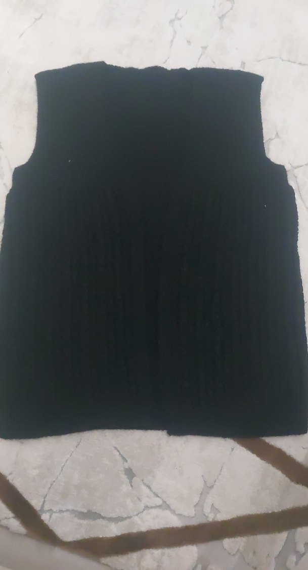 Siyah kolsuz yelek, V yaka ve pilili detaylara sahiptir. Normal uzunlukta, rahat kesim ve yumuşak, sıcak kumaştan üretilmiştir. Günlük kullanım için uygundur. hiç giyilmedi.