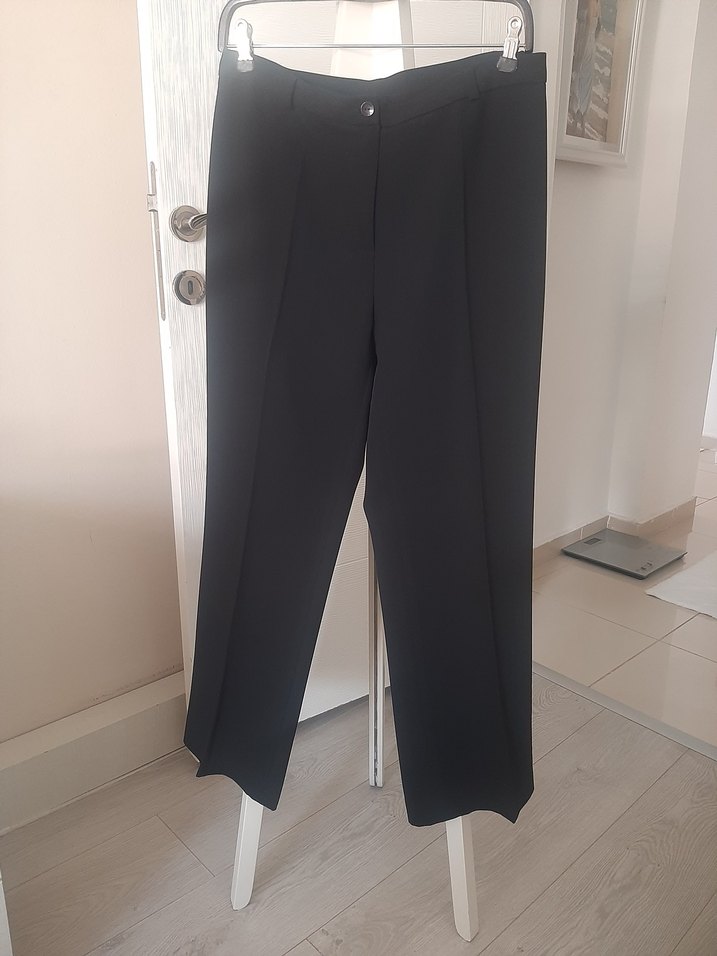 Siyah, ipeksi kumaştan yapılmış, normal boy ve pilili, düzenli kesim kadın kumaş pantolon. Ofis kullanımı için uygun, sade ve iş stiline uygun.