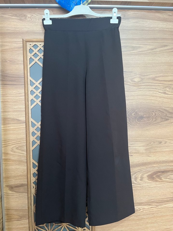 Siyah renkli, pilili detaylı kadın kumaş pantolon. Regular fit ve uzun boy. Pürüzsüz sentetik kumaştan, ofis ve günlük kullanıma uygun.