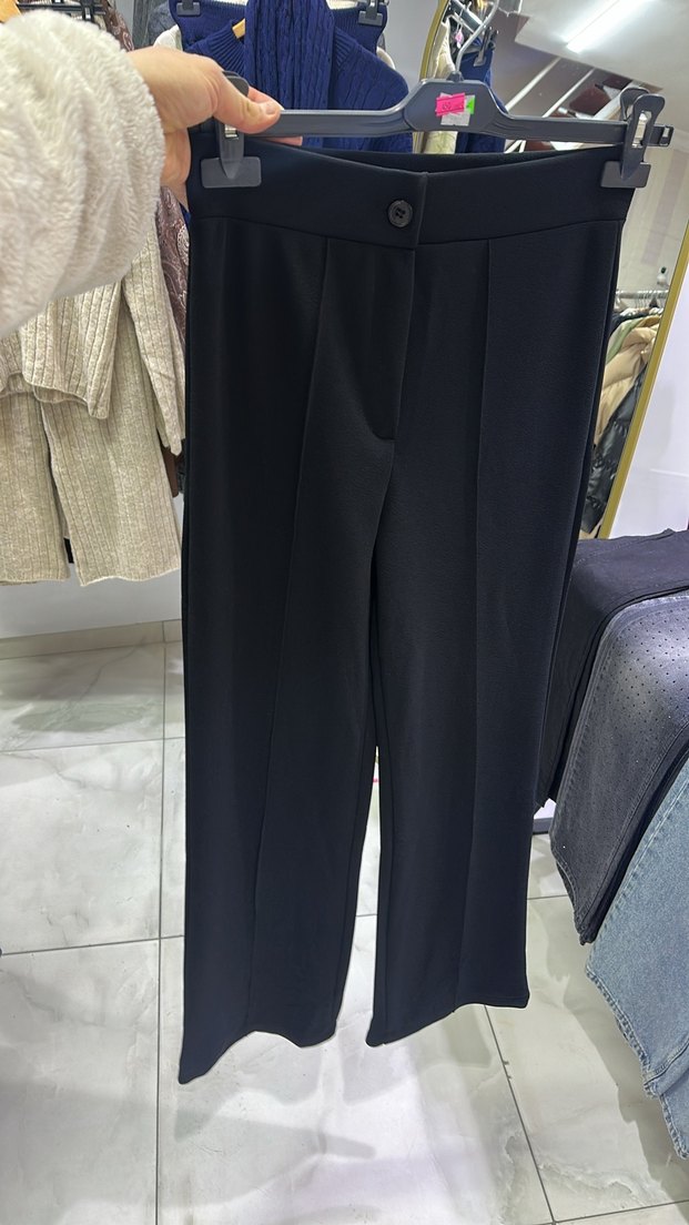 Düz siyah, pilili, uzun boylu kadın kumaş pantolon. Ofis için uygun, rahat sentetik kumaştan, regular fit kesim.
