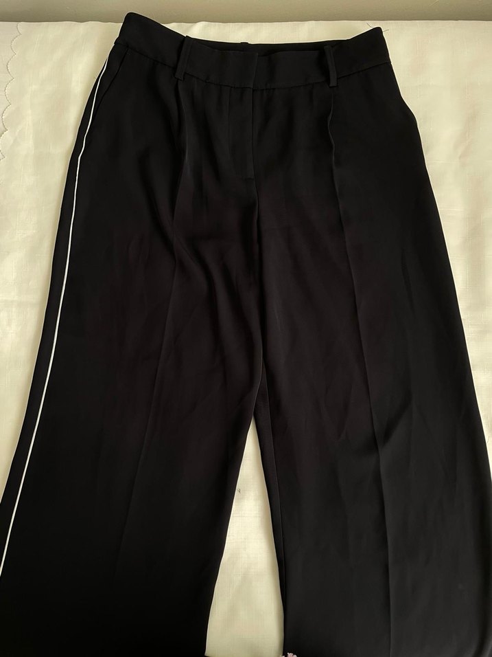 Siyah, pilili ve ince dokulu kumaştan yapılmış, regular fit kadın pantolon. Ofis ve günlük sokak stiline uygundur.